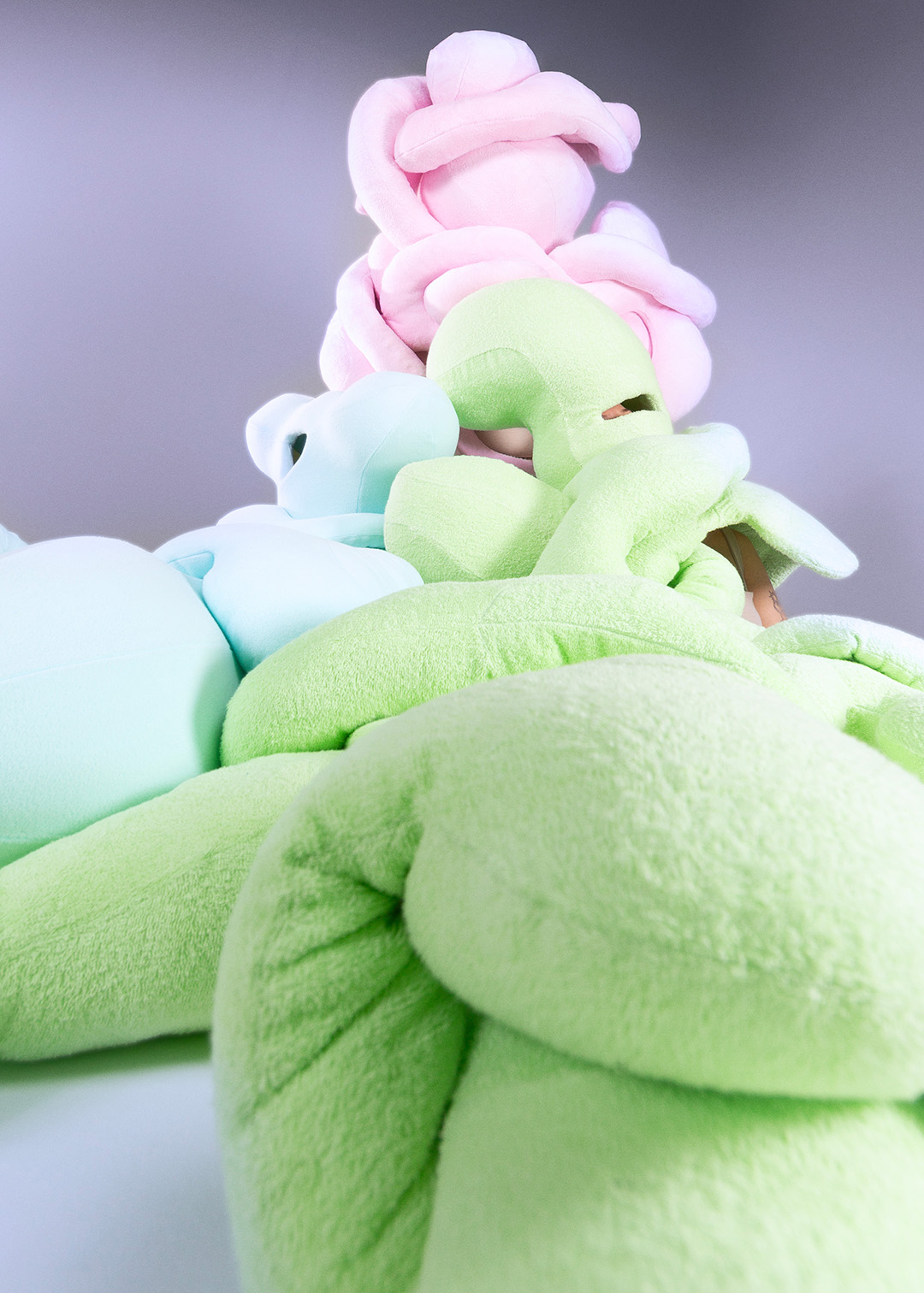 With Deceiving Happiness, Max Menschhorn addresses trauma as a barrier to the outside world and translates social defence mechanisms into physical space, where plush becomes wearable armour. The seemingly cheerful and carefree objects made of cuddly fabric, bright colours and organic shapes form a façade for selfprotection – Menschhorn creates portable structures that make isolation physically tangible and enable it to be experienced in shared warmth.