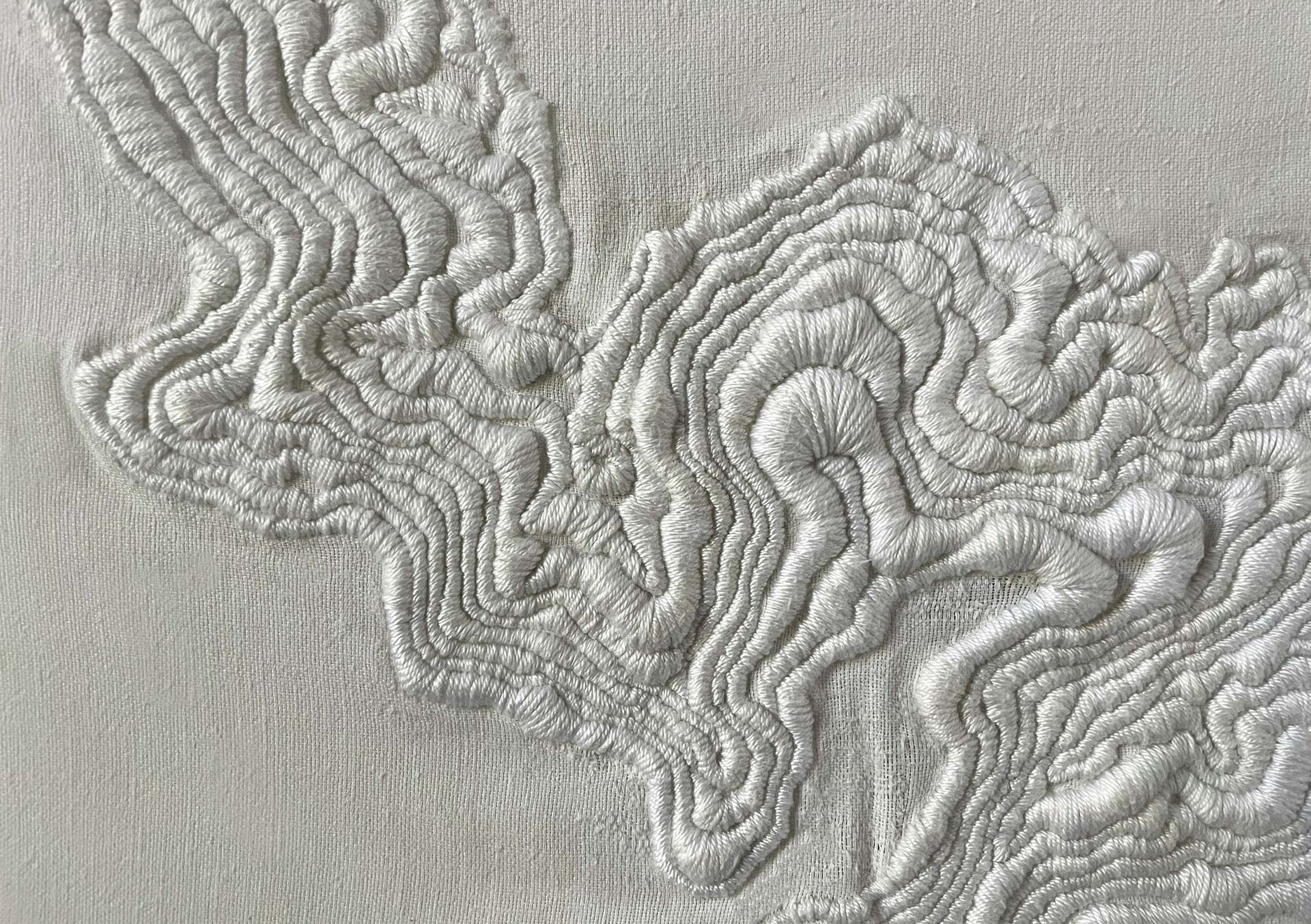 Olia Fedorovas Textilserie Maps of the Disappearing basiert auf topografischen Karten ihrer Heimat im Osten der Ukraine. Die Sticktechnik, weißer Faden auf weißem Stoff, ist traditionell in der Region Kharkiv verbreitet und spielt mit den Grenzen der optischen Wahrnehmung. Die linearen Muster zeigen vom militärischen Konflikt gezeichnete Gebiete am Rande der Auslöschung – Landschaften zwischen Identitätsverlust, Zerstörung und Tod.