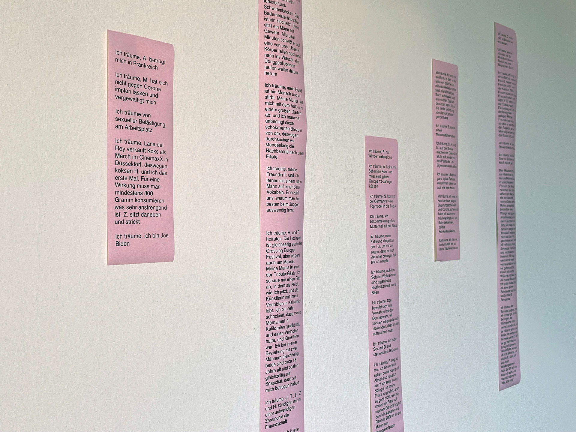 Inga Morawski has kept a dream journal over the past few years – over 100 dreams from it can be read in the installation Wovon ich Täume (What I Dream About). The artist reveals memories of dream hours in an intimate way, her journal entries ranging from simple everyday scenes to bizarre, chaotic episodes. Morawski seeks and creates spaces in which these nocturnal images can be stored after waking up.